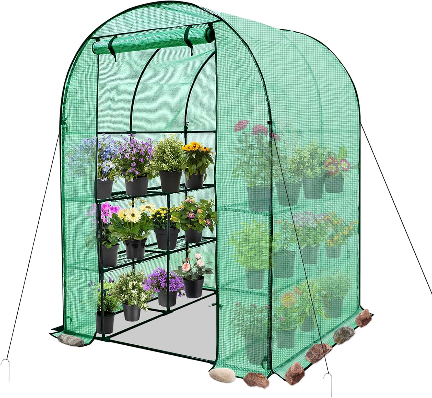 EAGLE PEAK 3-Tier Walk in Portable Greenhouse with 8 Wire Shelves, Indoor and Outdoor Garden House with Roll Up Zipper Door and Windows, Easy Set Up, 56.3"x56.3"x76.8", Clear/Green PE Cover