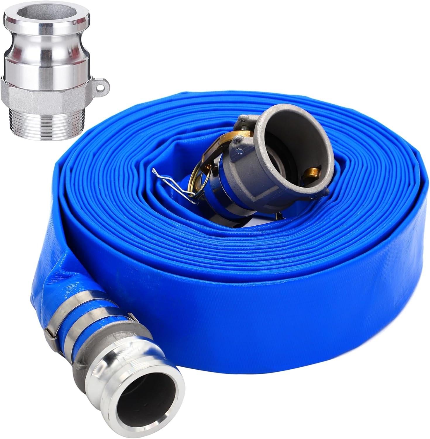 2" ID x 100 ft PVC Lay Flat Discharge Hose with Aluminum Camlock C and E Fittings, Cam Lock Fitting Type F included, Heavy Duty Reinforced Blue Backwash Pump Hoses for Swimming Drain Pools