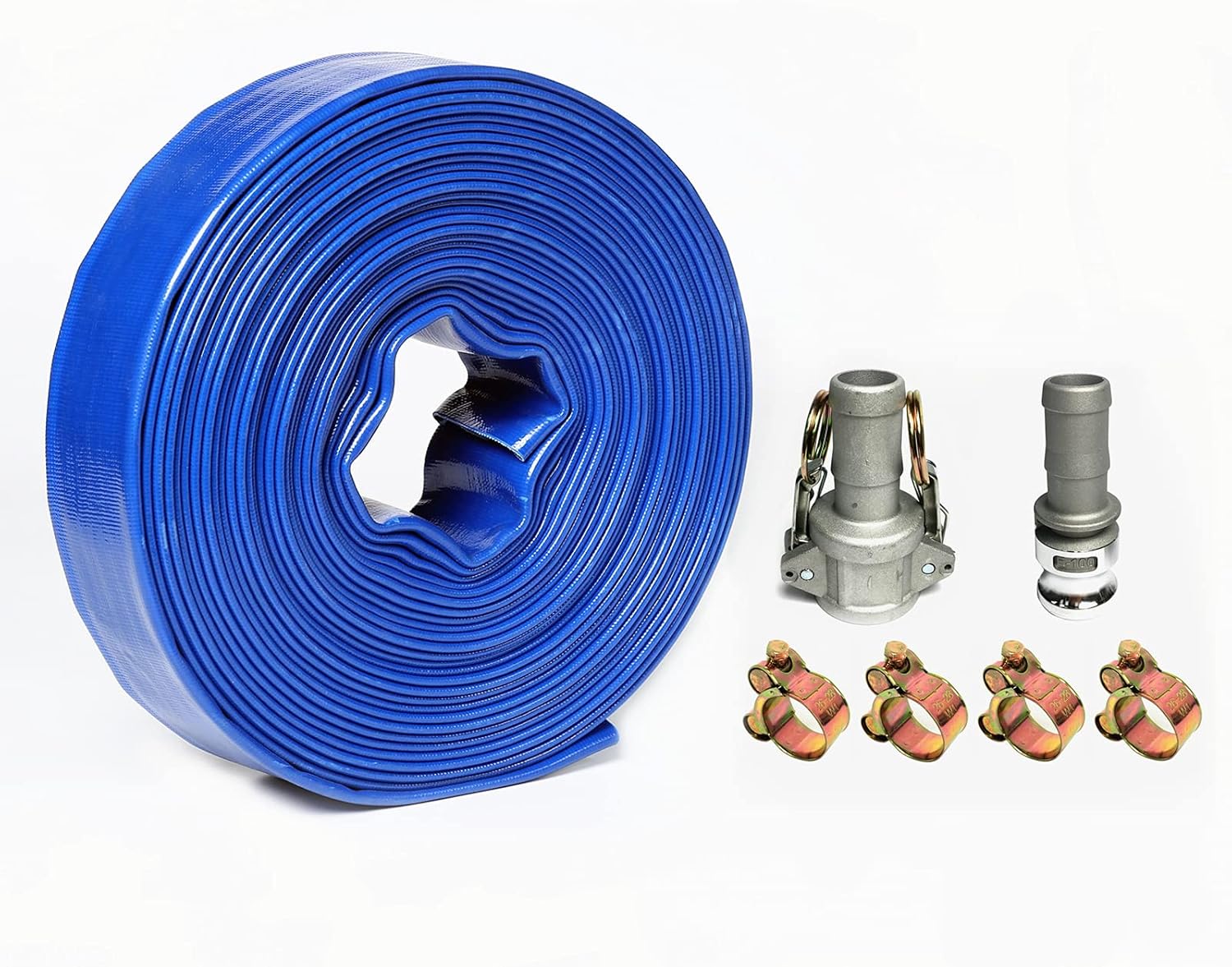 1" In Dia x 300 ft Heavy Duty Flat Lay Sump Pump Discharge and Backwash PVC Hose 4 Bar & Camlocks and Clamps (300)