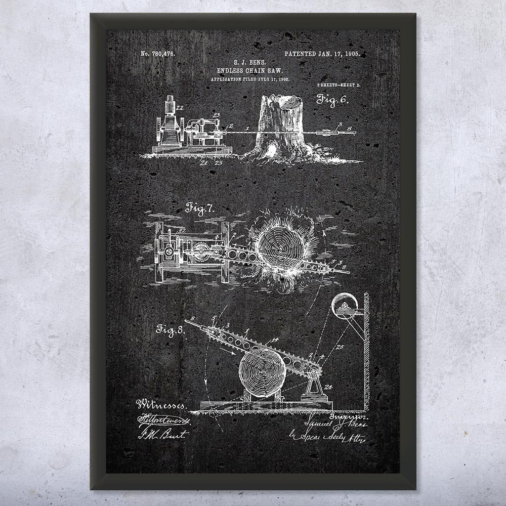 Framed Endless Chain Saw Print, Lumberjack Gift, Lumber Saw, Construction Worker, Logging Tools, Logger Gift, Workshop Dark Concrete (18x24)