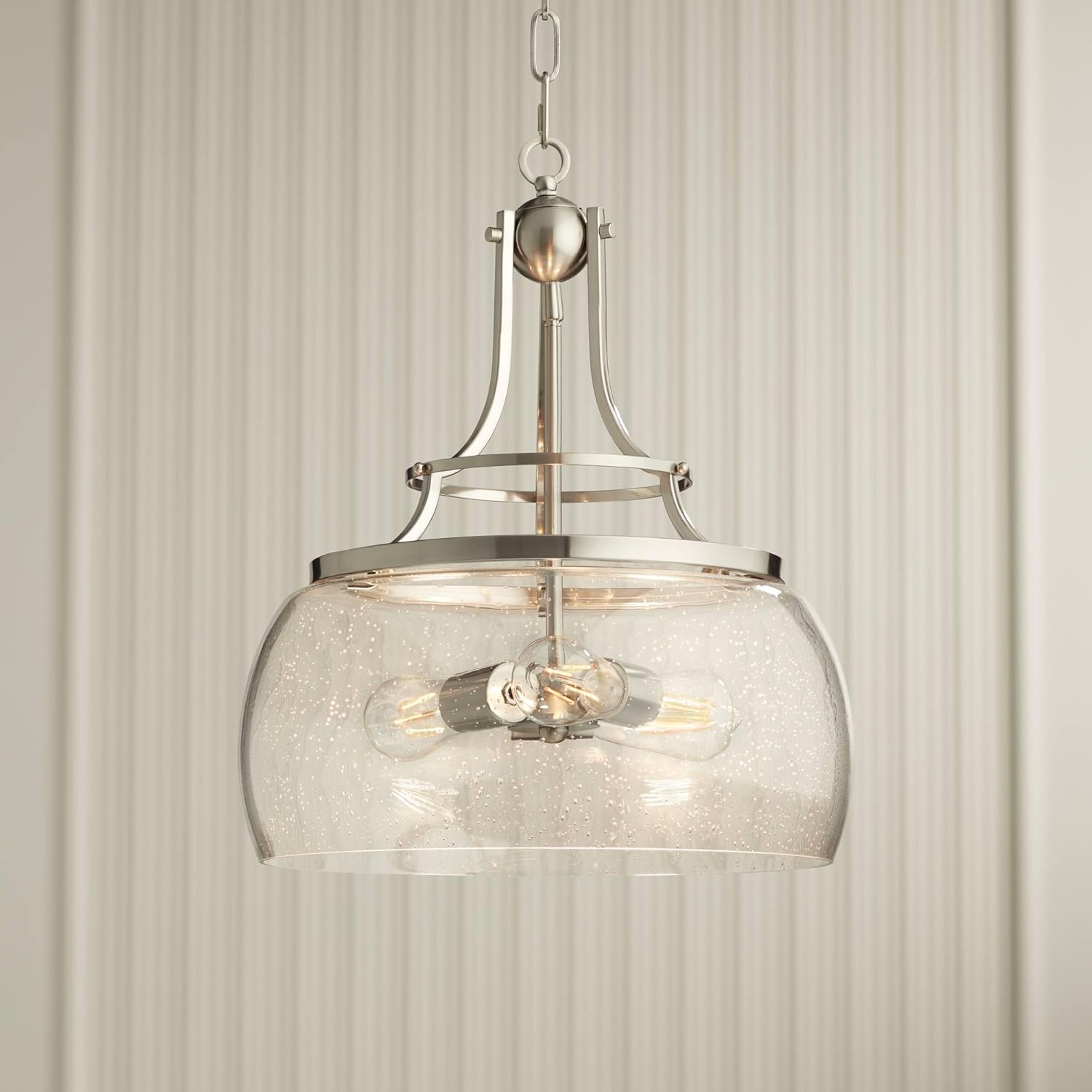 Franklin Iron Works Charleston Satin Nickel Pendant Chandelier 16" Wide Rustic Farmhouse Seeded Clear Glass LED 3-Light Fixture for Dining Room House Foyer Entryway Kitchen Bedroom Living Room