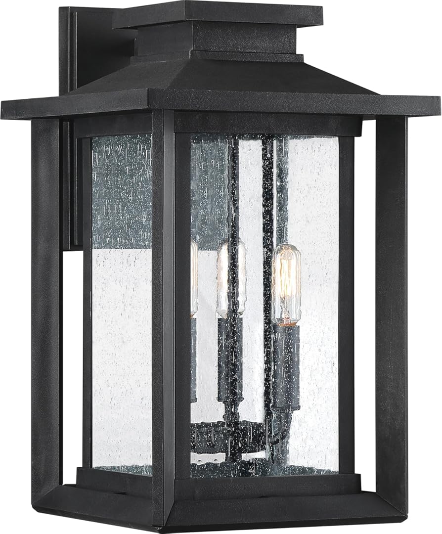 Quoizel Wakefield Vintage Wall Sconce, Coastal Armour 17 Inch 3-Light Earth Black Wall Lantern, Clear Seedy Glass Light Fixtures, 60W Candelabra Base Bulb, Outside Lights for Patio, Porch or Garage