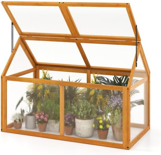 Orange Wooden Mini Greenhouse 40"x21"x28" - Portable Sturdy Fir Hot House with Adjustable Roof & Clear PC Panels for Plants, Vegetables, Flowers (8 lbs)