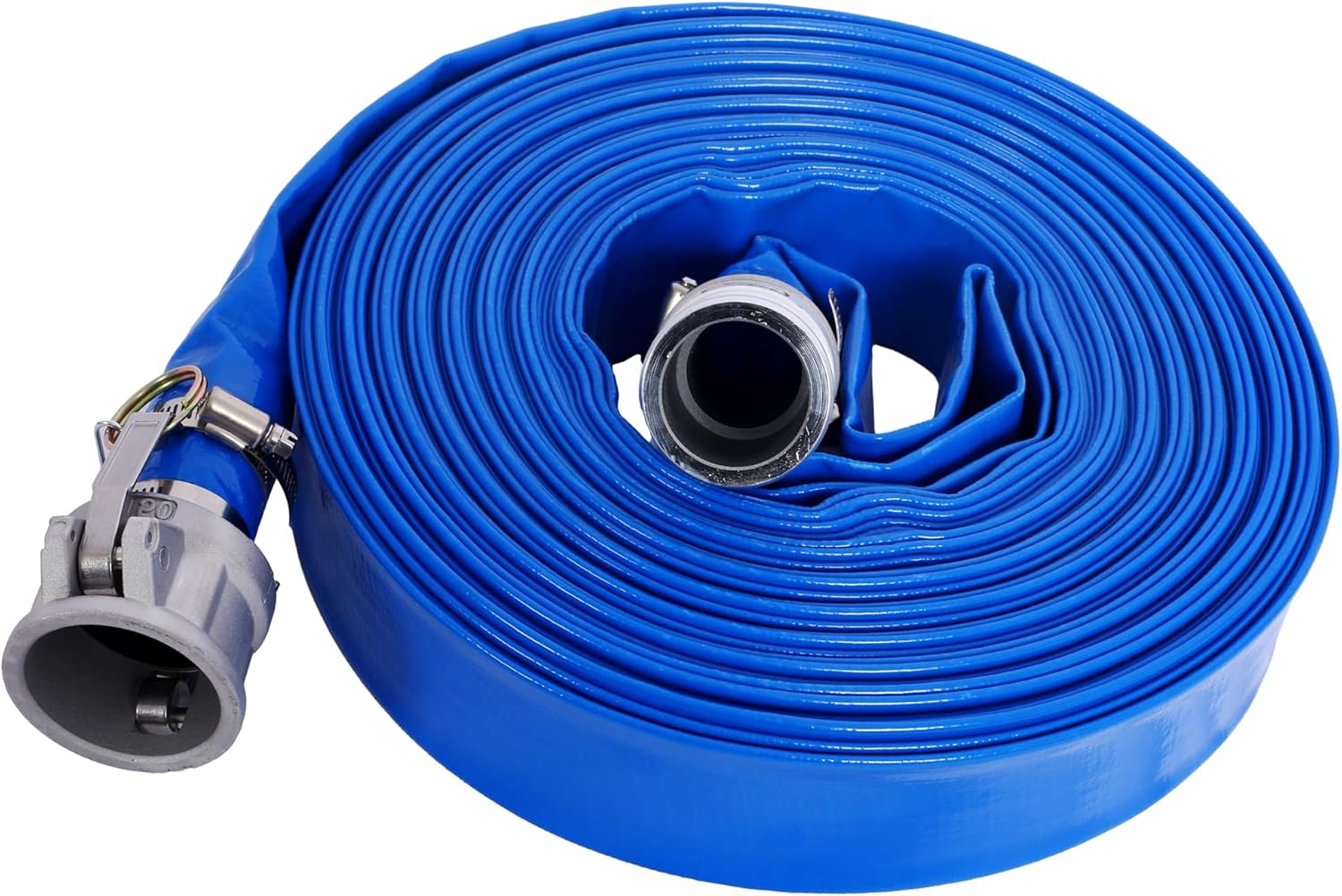 1.5" ID × 100 ft Pool Backwash Hose, Heavy Duty Reinforced Blue PVC Lay Flat Water Discharge Pump Hoses For Swimming Drain Pools and Clean Filters, with Aluminum Camlock C and E Fittings