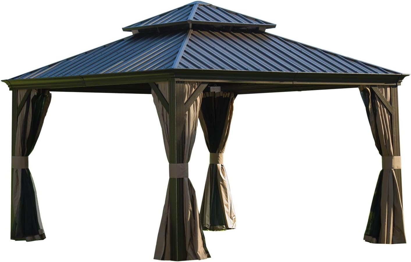 Outdoor Aluminum Hardtop with Galvanized Steel Double Canopy Brown Curtains – Patio, Deck, Backyard – Includes Netting 1 Door (1 Doors)