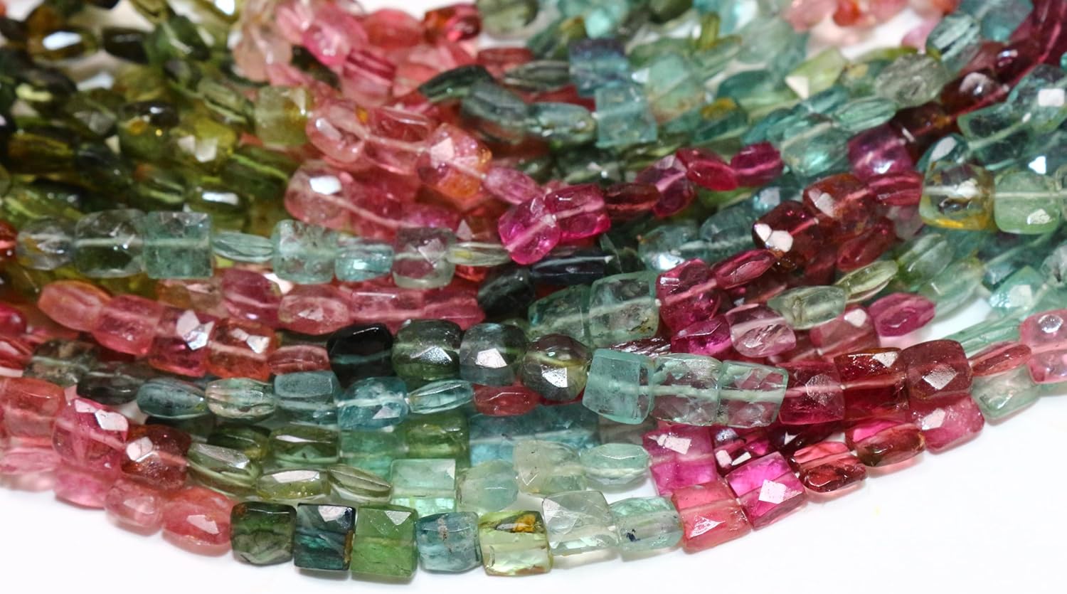 Natural Multi-Color Tourmaline Gemstone Beads, Faceted Cushion Cut, 5mm Size, 13 Inch Strand, Pink Green Mixed