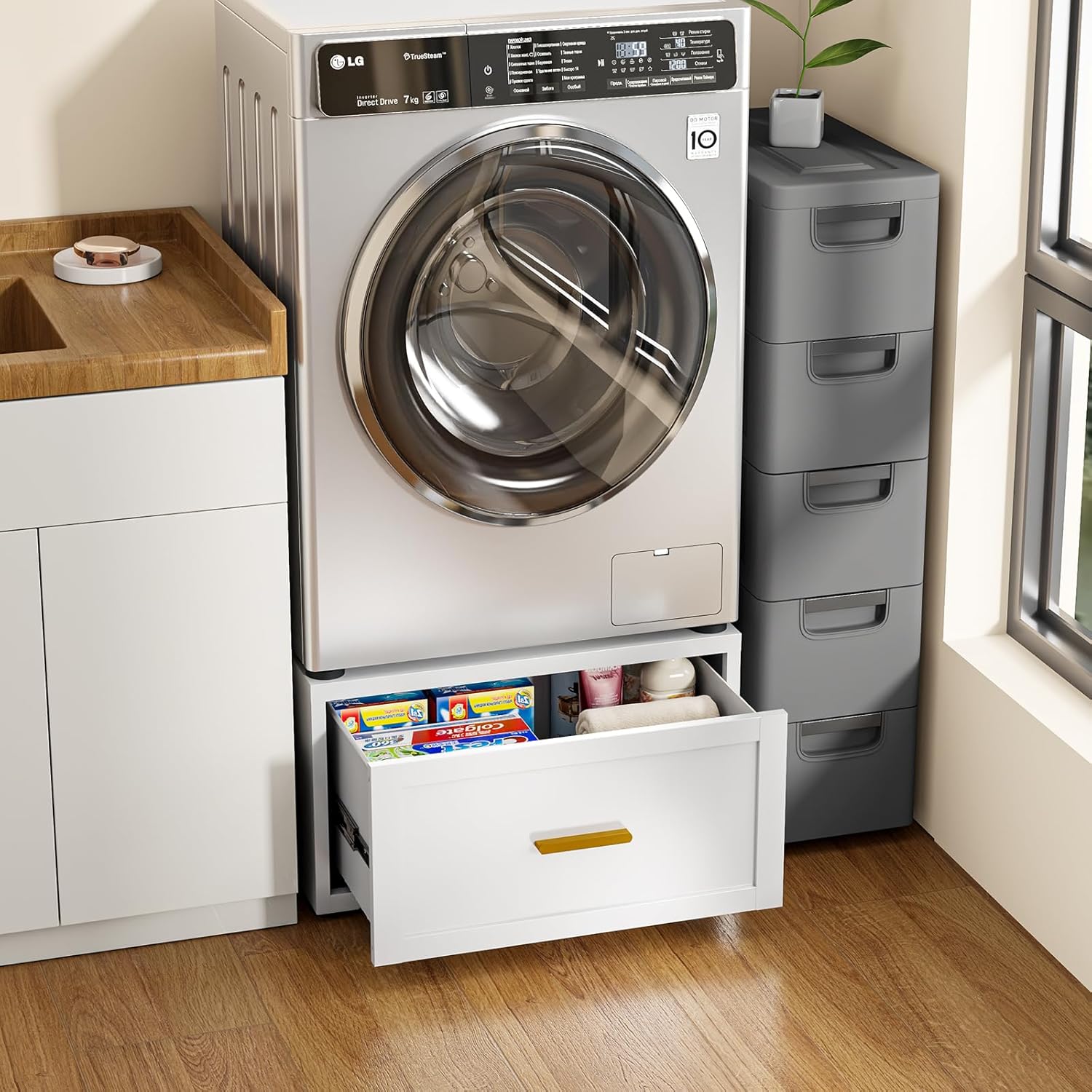 Washer and Dryer Pedestals, Laundry Pedestal Universal Fit Washing Machine Stand with Drawer Storage and Lundry Basket Shelf, 800LBS Capacity,White