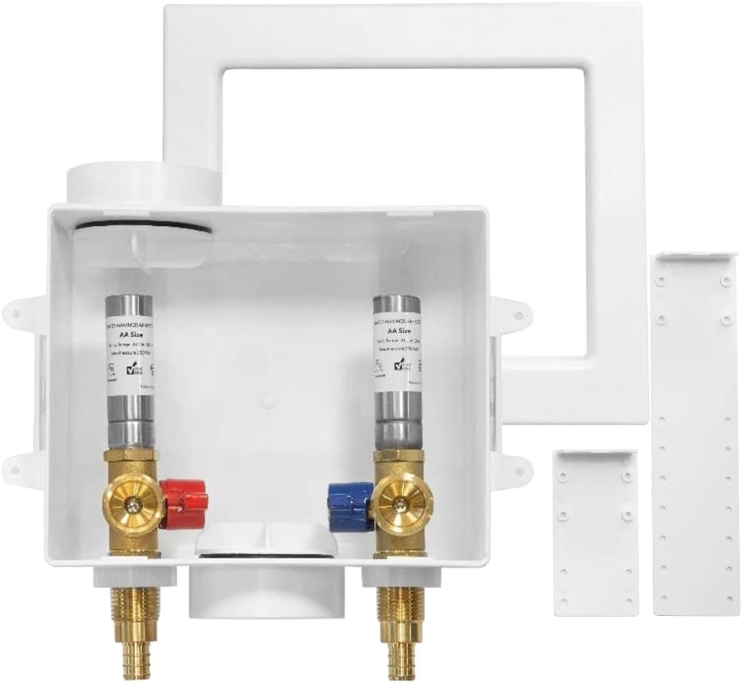 Washing Machine Outlet Box with Stainless Steel Water Hammer Arrestor,1/2 Inch PEX Inlet x 3/4 Inch MHT Outlet Connection Laundry Outlet Boxes,Washer Plumbing Box with Center Drain(WM007)