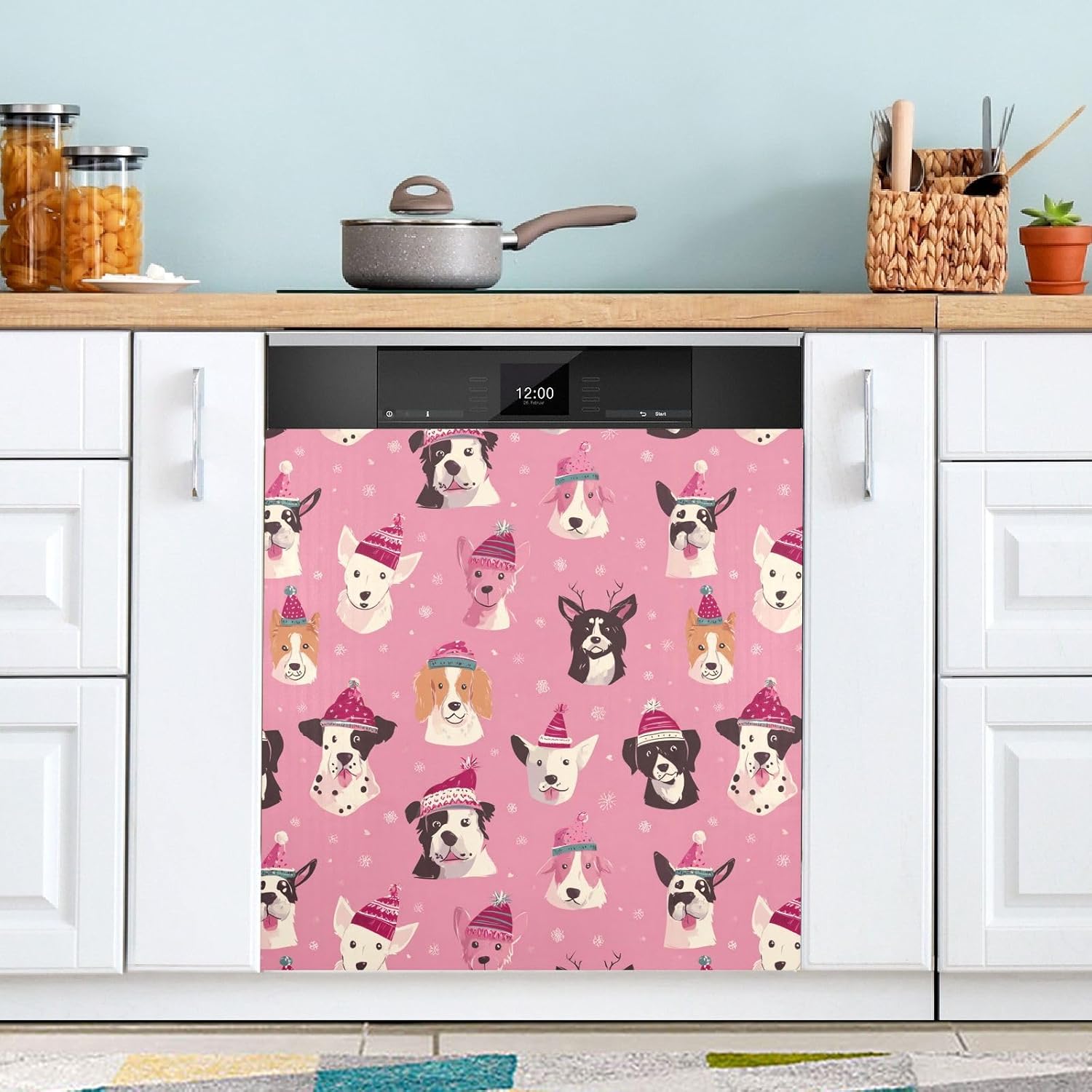 Pfrewn Christmas Winter Magnetic Dishwasher Cover Cartoon Christmas Dogs Pink Fridge Door Covers Kitchen Decal Vinyl Panel Decorative Refrigerator Laundry Appliances 23x26in