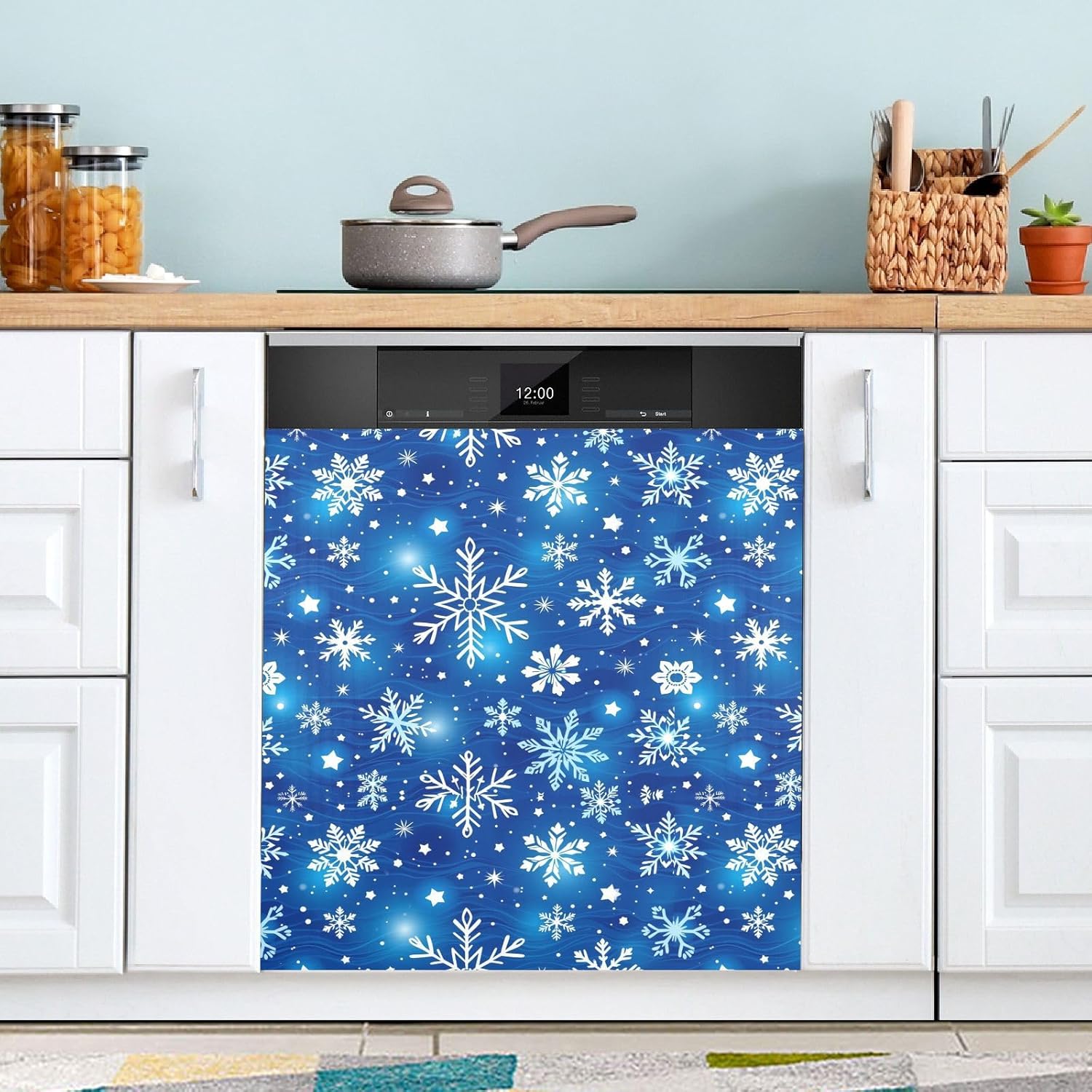 Pfrewn Christmas Winter Magnetic Dishwasher Cover Blue Christmas Snowflakes Stars Fridge Door Covers Kitchen Decal Vinyl Panel Decorative Refrigerator Laundry Appliances 23x26in