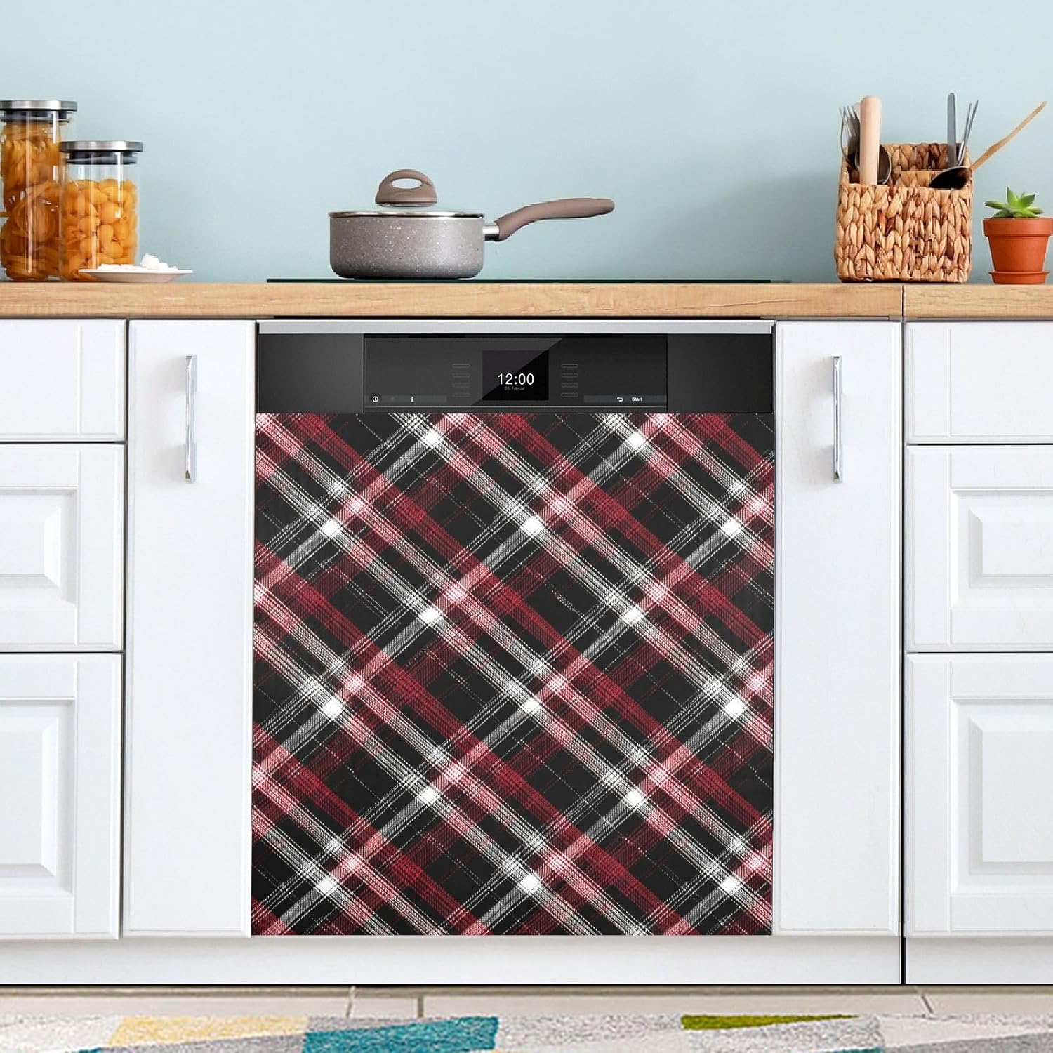 Pfrewn Christmas Winter Magnetic Dishwasher Cover Check Plaid Dark Red Black White Xmas (1) Fridge Door Covers Kitchen Decal Vinyl Panel Decorative Refrigerator Laundry Appliances 23x26in