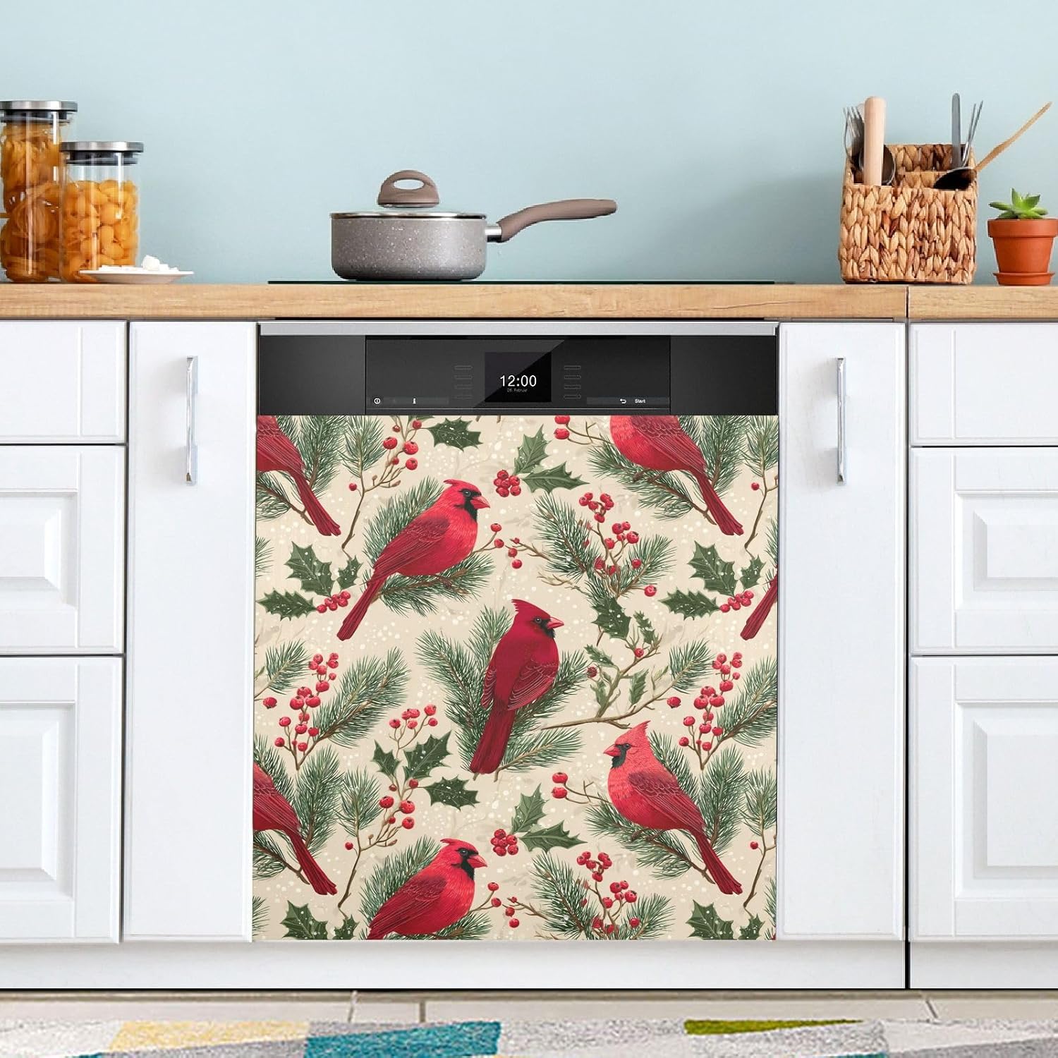Pfrewn Christmas Winter Magnetic Dishwasher Cover Christmas Red Cardinal Birds Berries Fir (1) Fridge Door Covers Kitchen Decal Vinyl Panel Decorative Refrigerator Laundry Appliances 23x26in