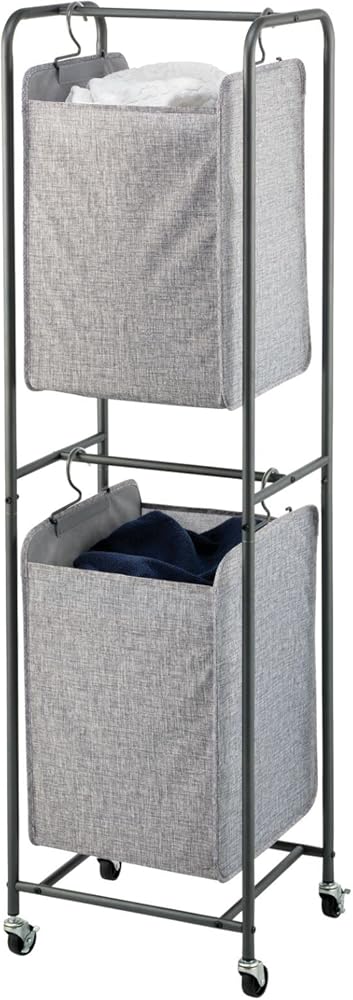 mDesign Vertical Stacked Laundry Hamper Basket with Wheels, Portable, 2 Removable Bags for Organizing Clothes, Laundry, Lights, Darks - Strong Metal Frame - Dark Gray