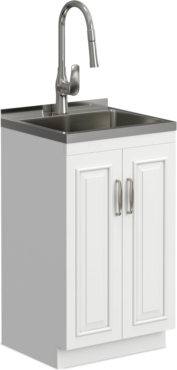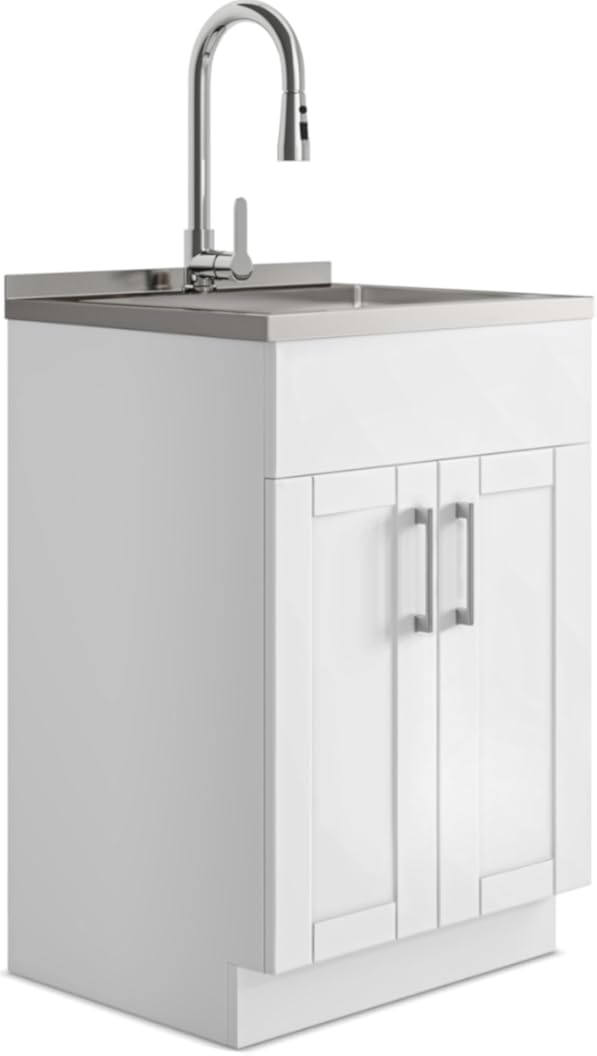 30-Inch Laundry Sink with Cabinet and Pull-Out Faucet, Stainless Steel Utility Sink with Cabinets, Freestanding White Cabinet with Sink for Laundry & Utility Room, Kitchen, Bathroom