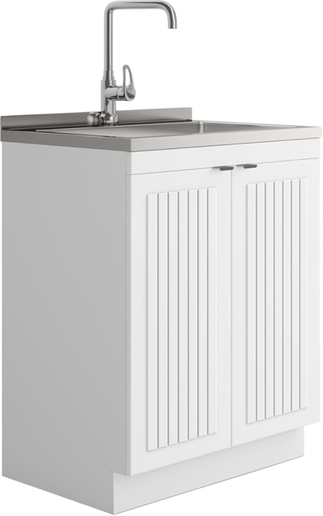 SIMPLIHOME Murphy All-in-One Utility Sink & Cabinet, Pure White, 28-inch Laundry Cabinet, Faucet, 10-inch Deep Stainless Steel Sink, Beadboard Doors, Laundry Room Storage