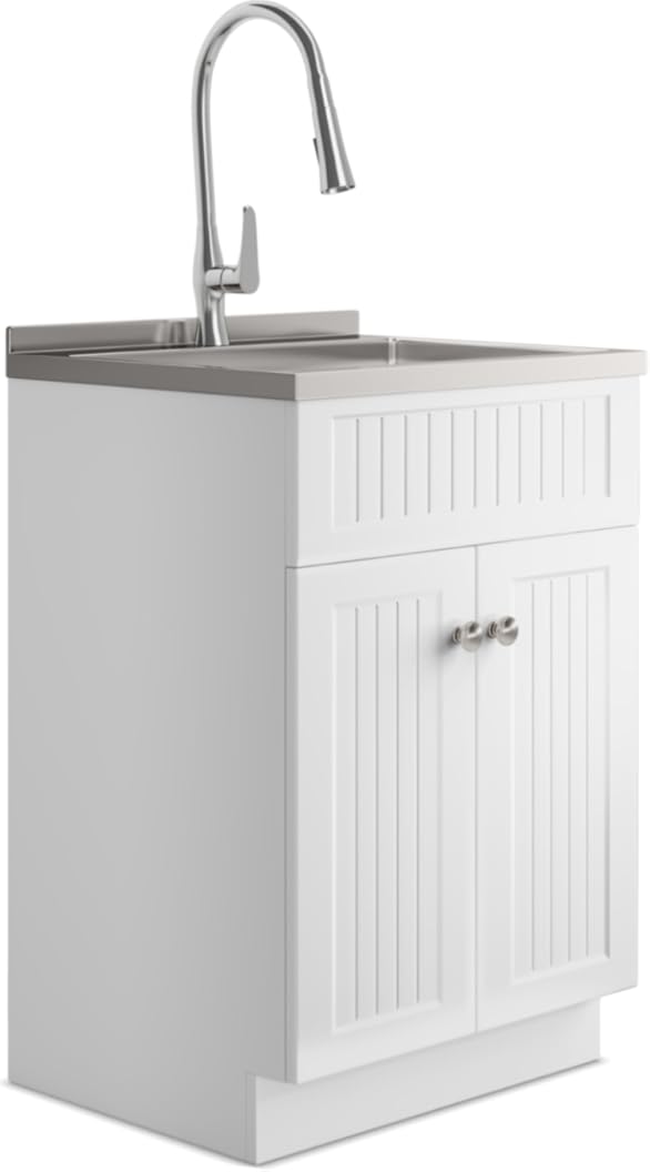 SIMPLIHOME Beckham All-in-One 24 inch Wide Utility Sink and Laundry Cabinet in Pure White Finish, Transitional Stainless Steel Sink Cabinet for Laundry Rooms with High-Arch Brushed Nickel Faucet