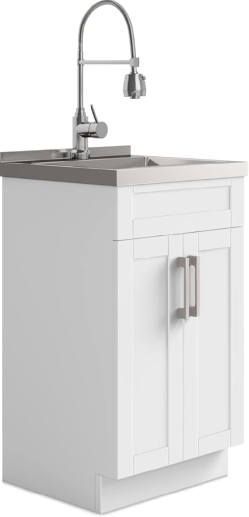 SIMPLIHOME Hennessy All-in-One 20 inch Wide Utility Sink and Laundry Cabinet in Pure White Finish, Transitional Stainless Steel Sink Cabinet for Laundry Rooms with High-Arch Chrome Faucet and Storage