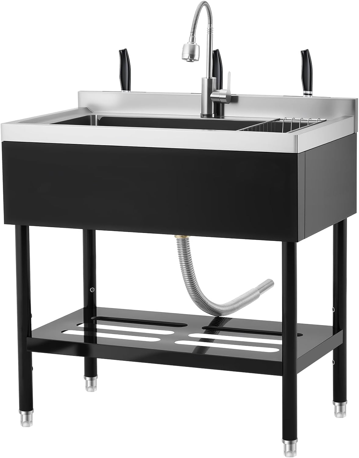 Garvee 36" Black Stainless Steel Utility Sink with Faucet, Adjustable Height Freestanding Commercial Sink with Hot & Cold Water, Shelf, Basket & Drain Kit for Kitchen, Garage, Laundry, or Outdoor Use