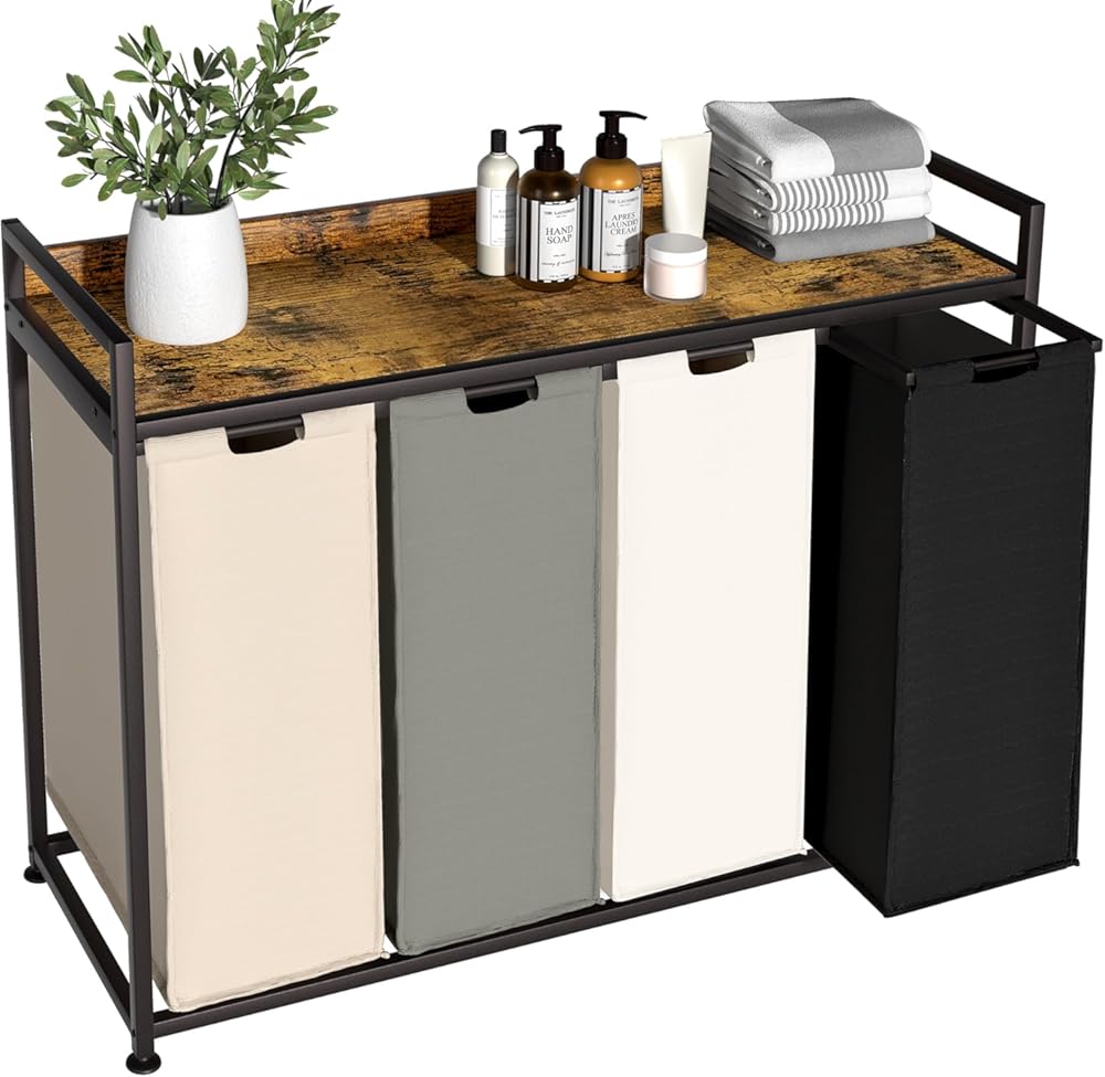 Laundry Hamper with Shelf, Laundry Basket 4 Section, Laundry Sorter with Pull-Out Removable Large 4 Color Bags and Movable Wheels, Metal Frame, 4 x 15.87 Gallons (60L), Rustic Brown PF07XLN