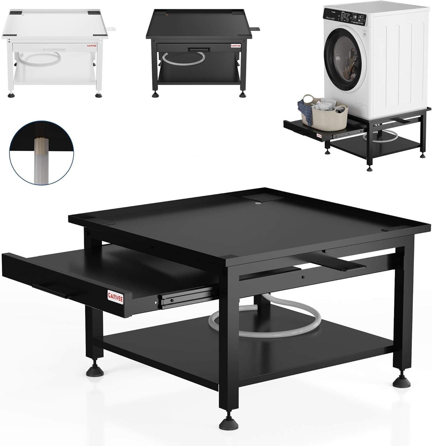 Garvee 27" Wide Washer and Dryer Pedestals with Pullout-Shelf, 16" Hight Laundry Pedestal with Adjustable Anti-Vibration Pads, Drain Pan and Hose, 1000 lbs Capacity, Black
