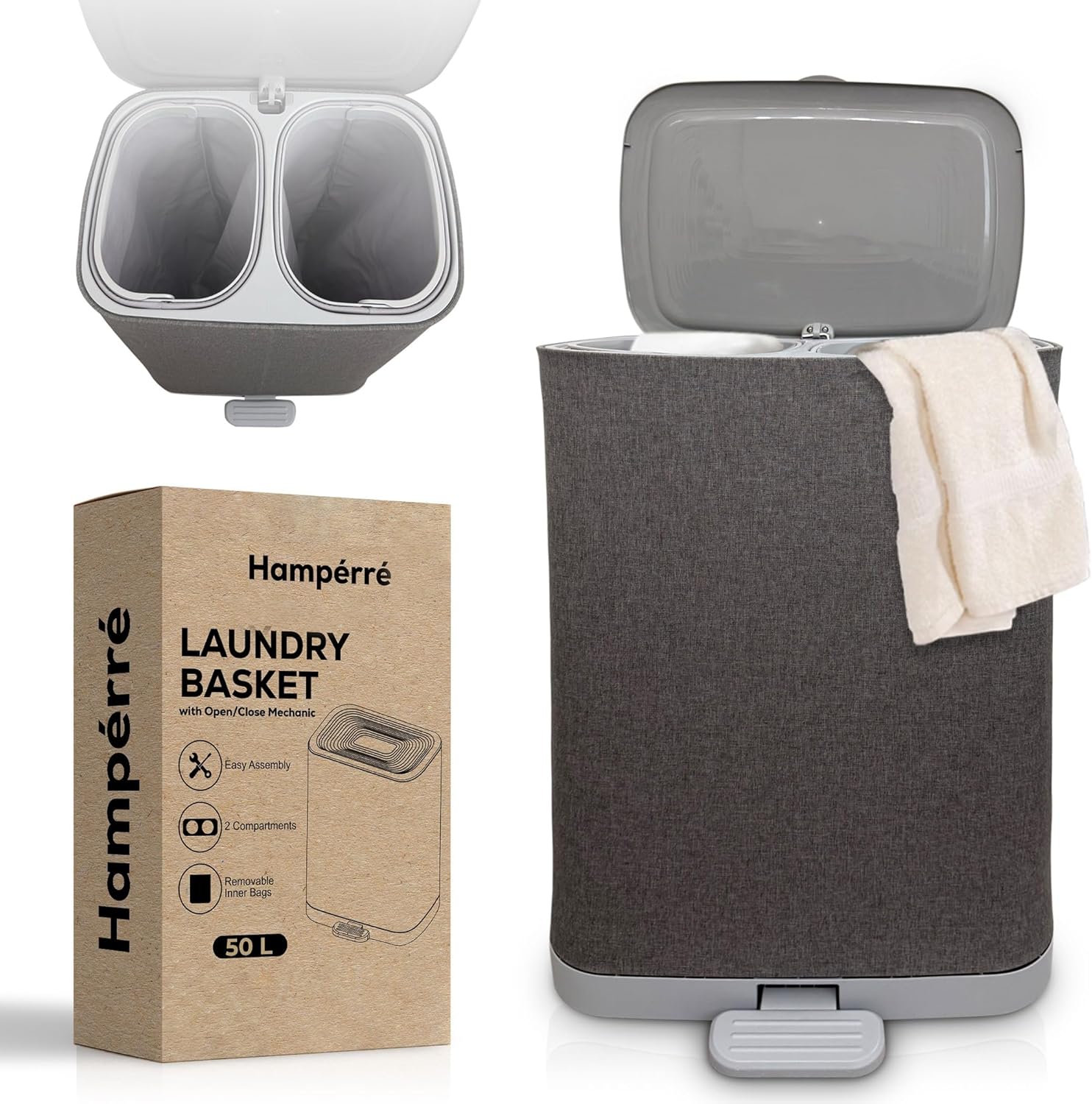 Hampérré Dual Compartment Laundry Hamper – 50 Liter Large Laundry Basket with Lid & Foot Pedal – Removable Bags, Waterproof Fabric, Modern Design, Easy Sorting for Clothes, Bedroom & Laundry Room