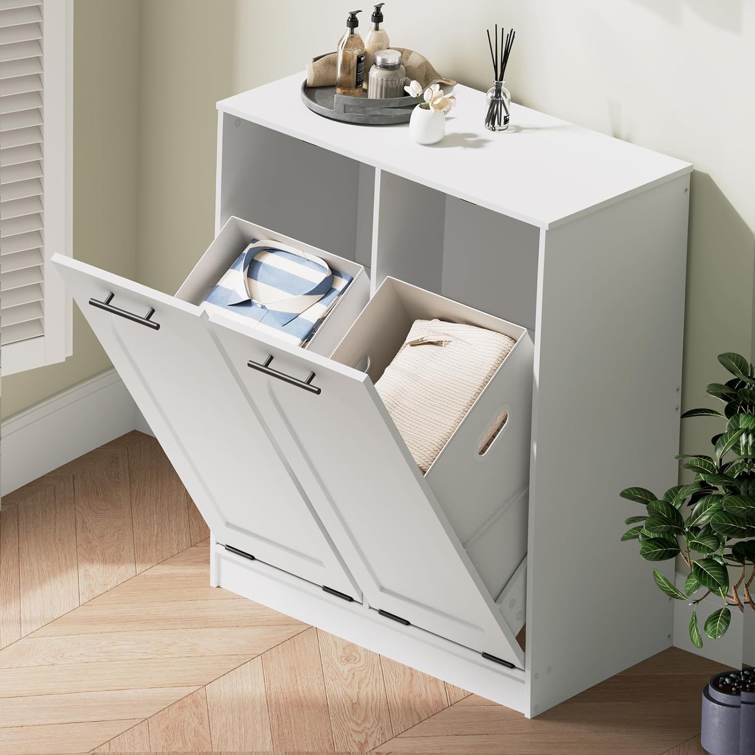 HOOBRO Double Tilt Out Laundry Hamper Cabinet, 22 Gal. (83 L) Laundry Cabinet with 2 Hidden Baskets, Farmhouse Storage Basket, Trash Can for Bathroom, Kitchen, 14.2" x 28.3" x 32", White WT81XY01N1
