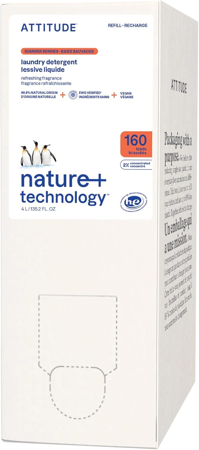ATTITUDE Liquid Laundry Detergent Refill, EWG Verified, HE Compatible, Plant-Based & Vegan, Natural Laundry Soap, Summer Berries Scent, 160 Loads, 135.26 Fl Oz