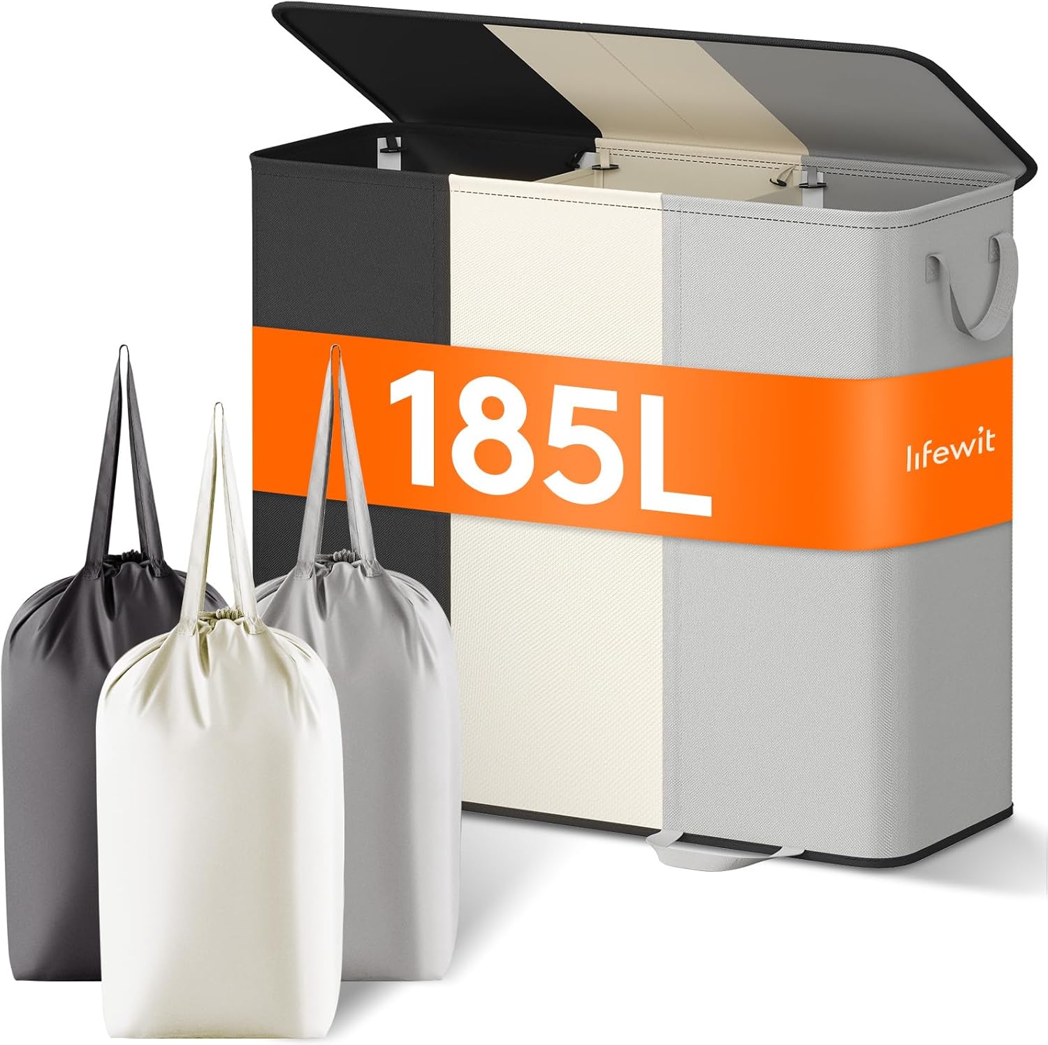 Lifewit Triple Laundry Hamper with Lid and Removable Laundry Bags, Large Collapsible 3 Dividers Dirty Clothes Basket with Handles for Bedroom, Laundry Room, Closet, Bathroom, 185L Black&White&Gray