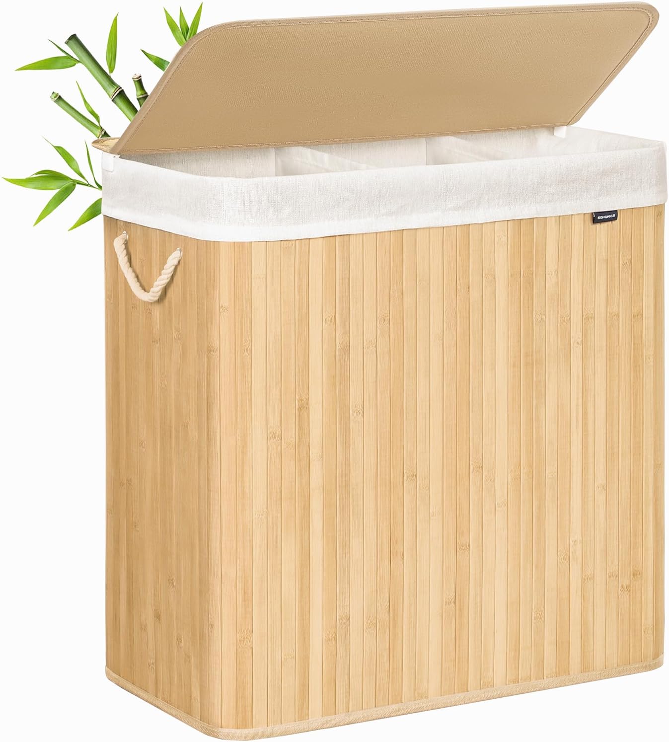 SONGMICS Laundry Hamper, 39.6 Gal. (150 L), 3-Section Laundry Basket, Laundry Hamper with Lid, Bamboo, Foldable, Removable and Machine Washable Liner, for Laundry Room, Bedroom, Natural ULCB091N01