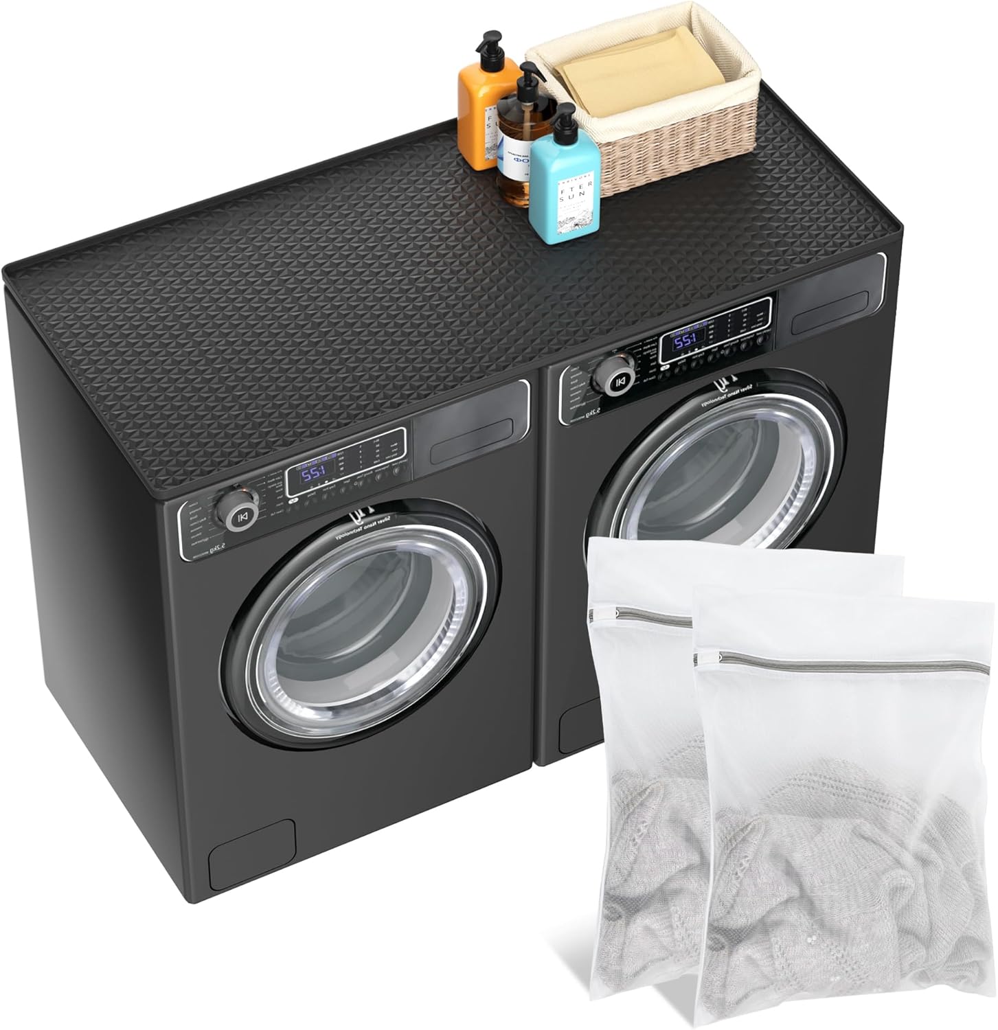 54" x 27.5" Silicone Washer Dryer Countertop Mat with 2 Laundry Bags – Non-Slip, Waterproof, Dustproof Cover for Laundry Room Organization & Surface Protection (Black, Extra Large)