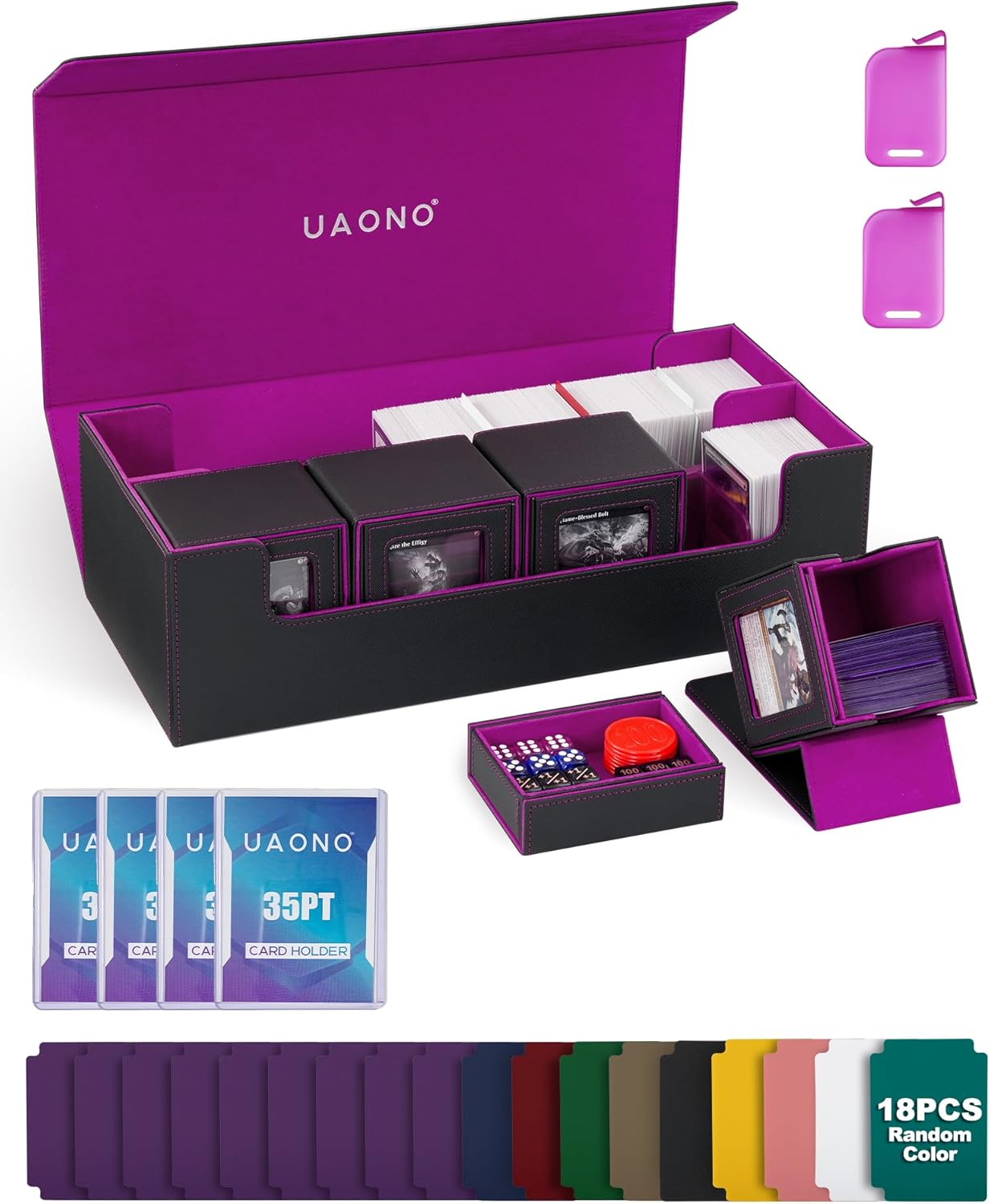 Card Storage Box for Trading Cards, 5 in 1 Card Deck Case with 4 Pcs Small Commander Deck Box, Large Card Box for MTG/TCG/PTCG Magic Sports Cards Game Playmat (Black, Purple)