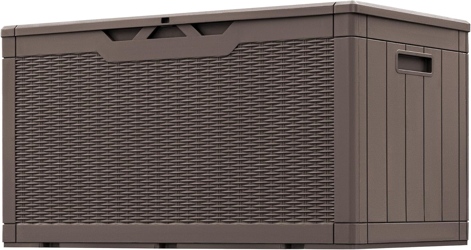 Greesum 100 Gallon Resin Patio Storage Box for Garden Tools, Outdoor Furniture Cushions, Pool Supplies, Dark Brown