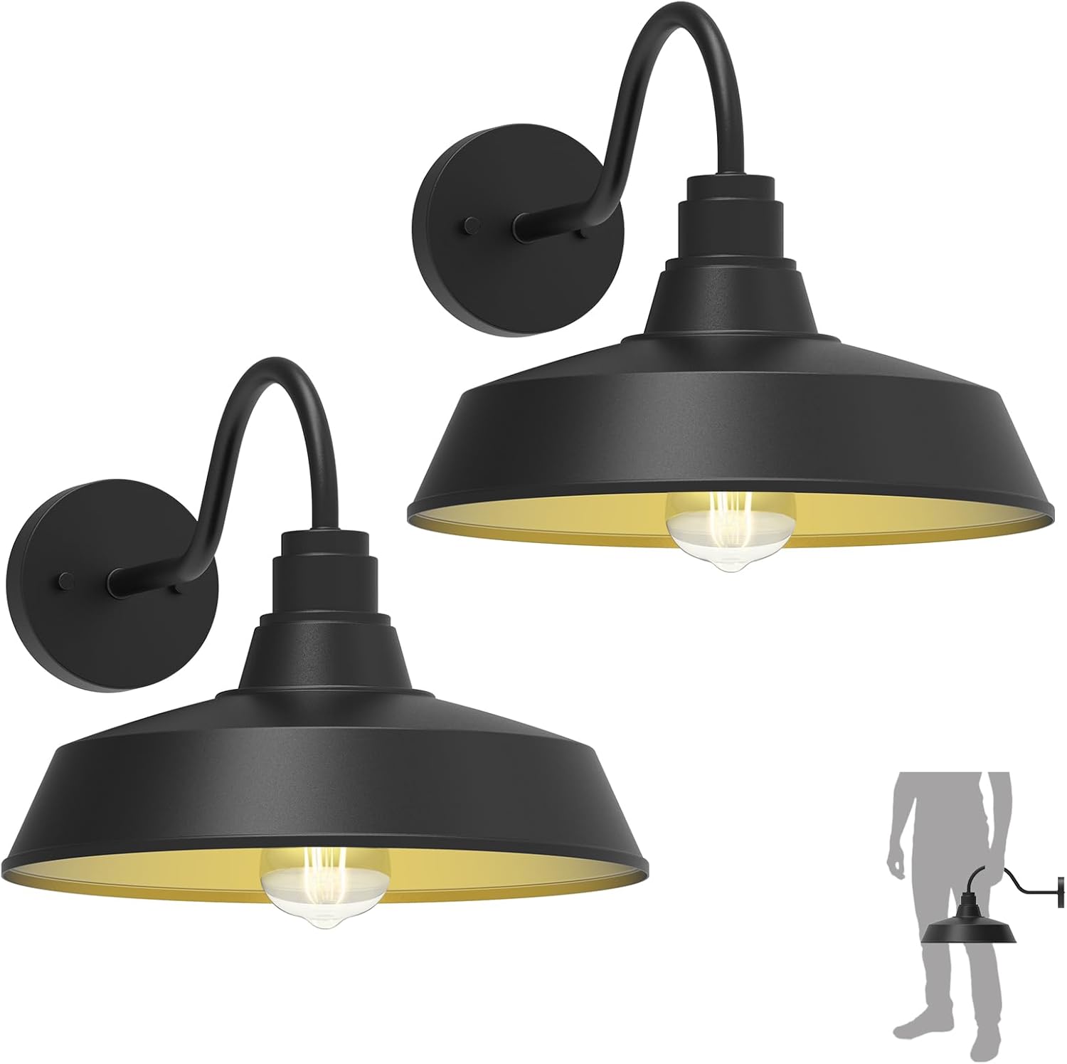 14.5" Dome Gooseneck Barn Light, Outdoor Anti-Rust&Waterproof Farmhouse Wall Sconce, Outdoor Wall Lanterns for Porch/Patio, E26 Base 100W Max(Black 2-Pack Exterior Lighting Fixtures)