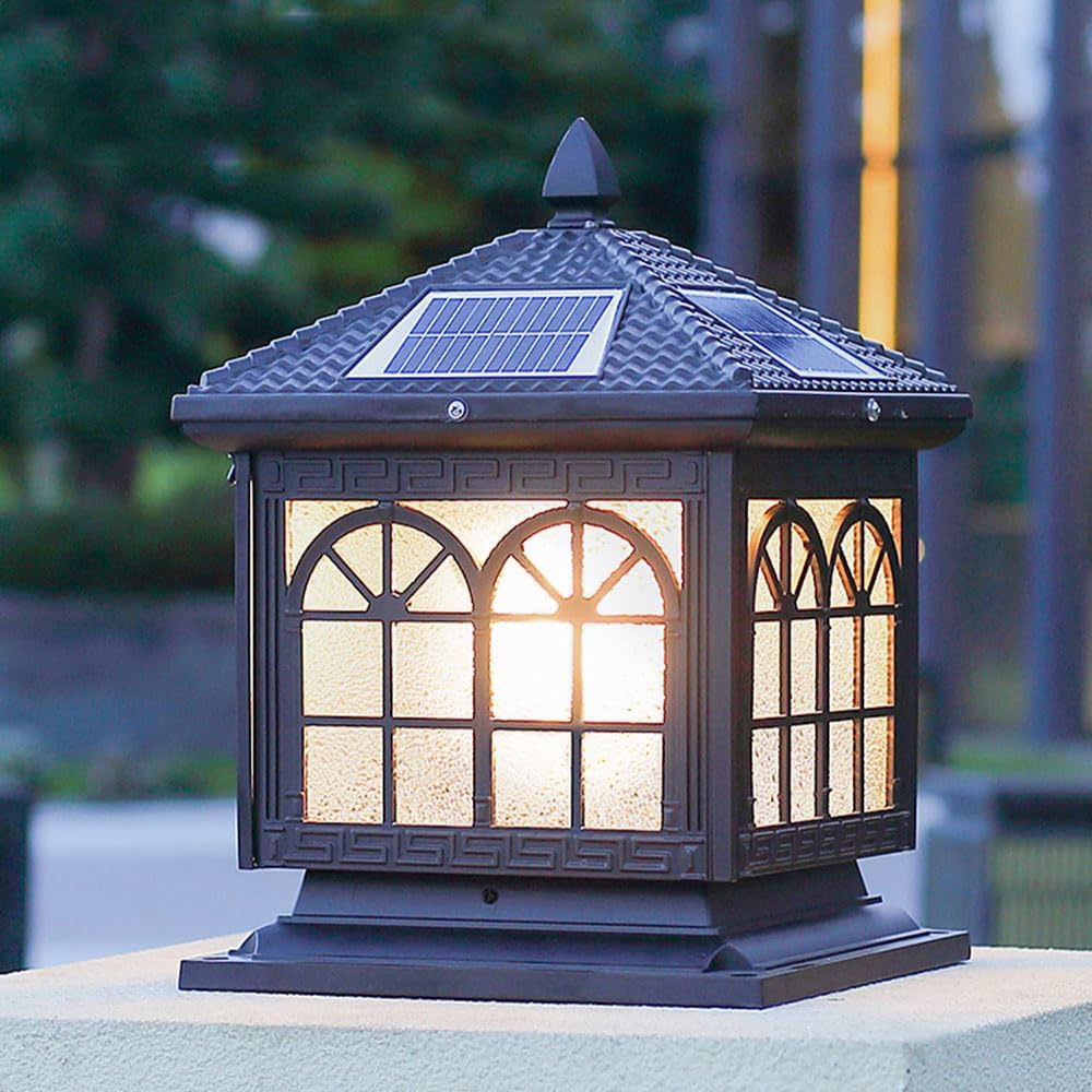 Chinese Style Solar Post Lights Outdoor Black Pillar Light with Remote Control to Adjust Warm Cold Light Vintage Solar Powered Lamp Post Light for Wood Fence,Deck Garden Yard