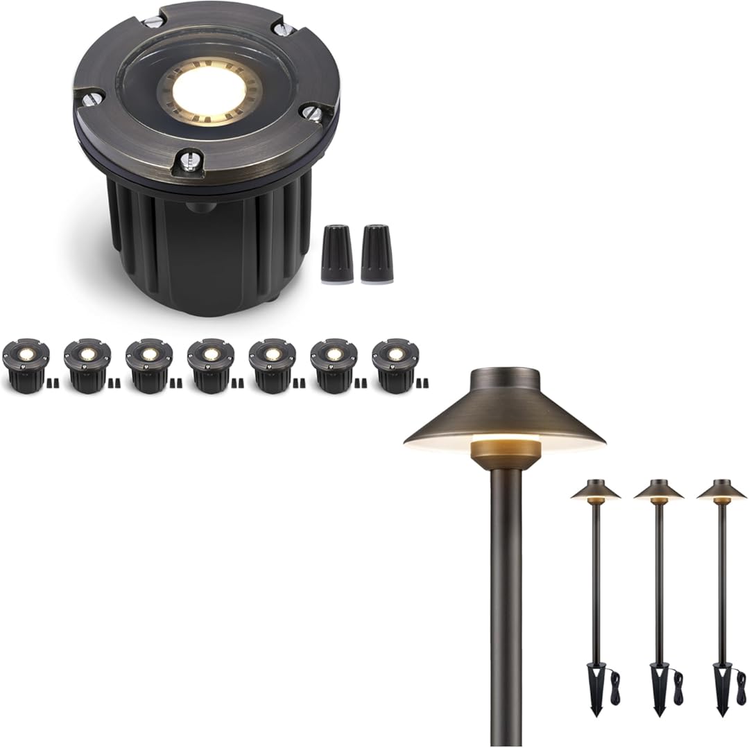Gardenreet Low Voltage Landscape In Ground Lights Bundle, 4-Pack Brass 12V Well Light Wired, 8-Pack Brass LED Pathway Lights Outdoor, IP65 Waterproof with Bulb