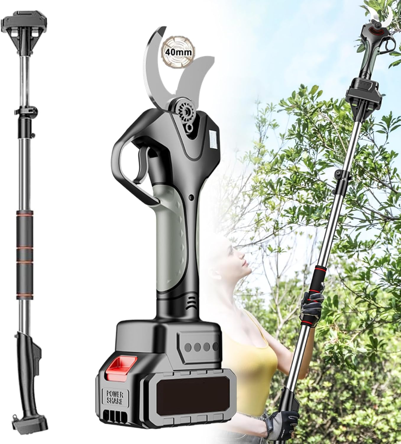 Professional Cordless Electric Garden Pruning Shears 40mm Cutting Rust-Proof Garden Pruning Shears with Maximum Extension of 210cm for Gardens Parks Farms Greenhouse,2batteries