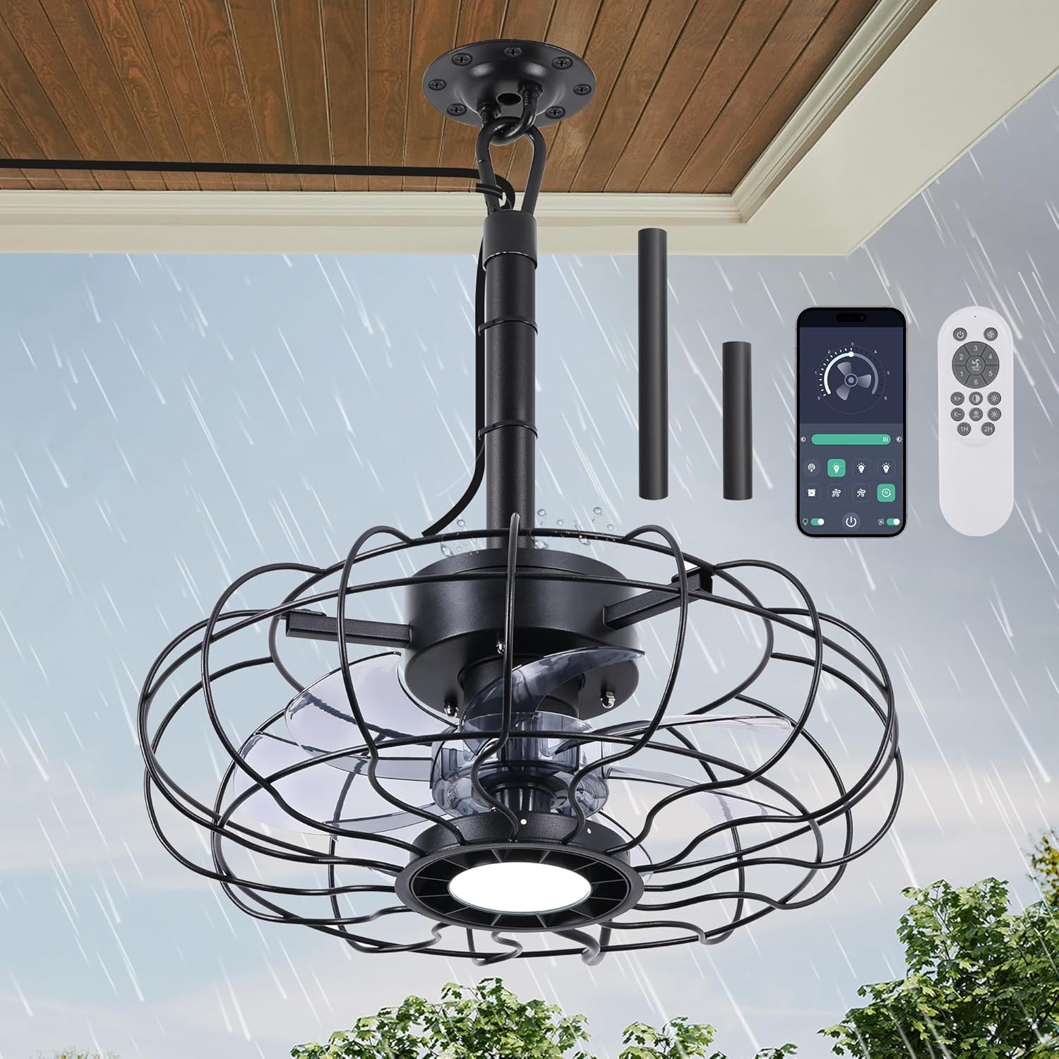 15" Outdoor Ceiling Fan with Light, with Remote and App Remote, IP65 Waterproof Gazebo Hanging Fan, 3CCT Dimmable, Portable Plug in Ceiling Fan with Cord Hook for Patio Porch Pergola Indoor(Black)