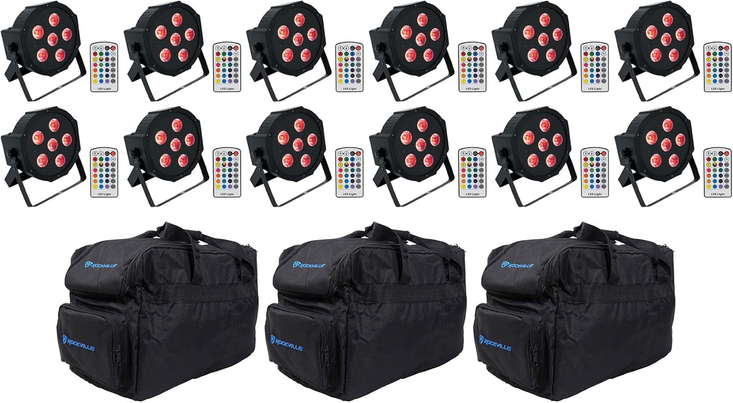 (12) Rockville Battery PAR 6RF Rechargeable Wireless DMX Lights+RF Remotes+Bags