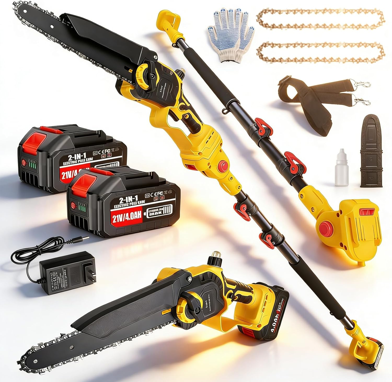 2-in-1 Electric Pole Saw, Cordless Pole Saw & 8 Inch Brushless Mini Chainsaw with 2x 4.0Ah Battery, Brushless Motor, Electric Pole Saw for Tree Trimming with Adjustable Extension Pole