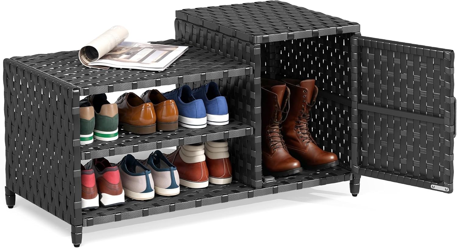YITAHOME Wicker Pool Storage Organizer, All-weather Storage Bin Multi-functional Equipment for Pool Floats, Porch Shoe, Garden Tool, Garage (Black)