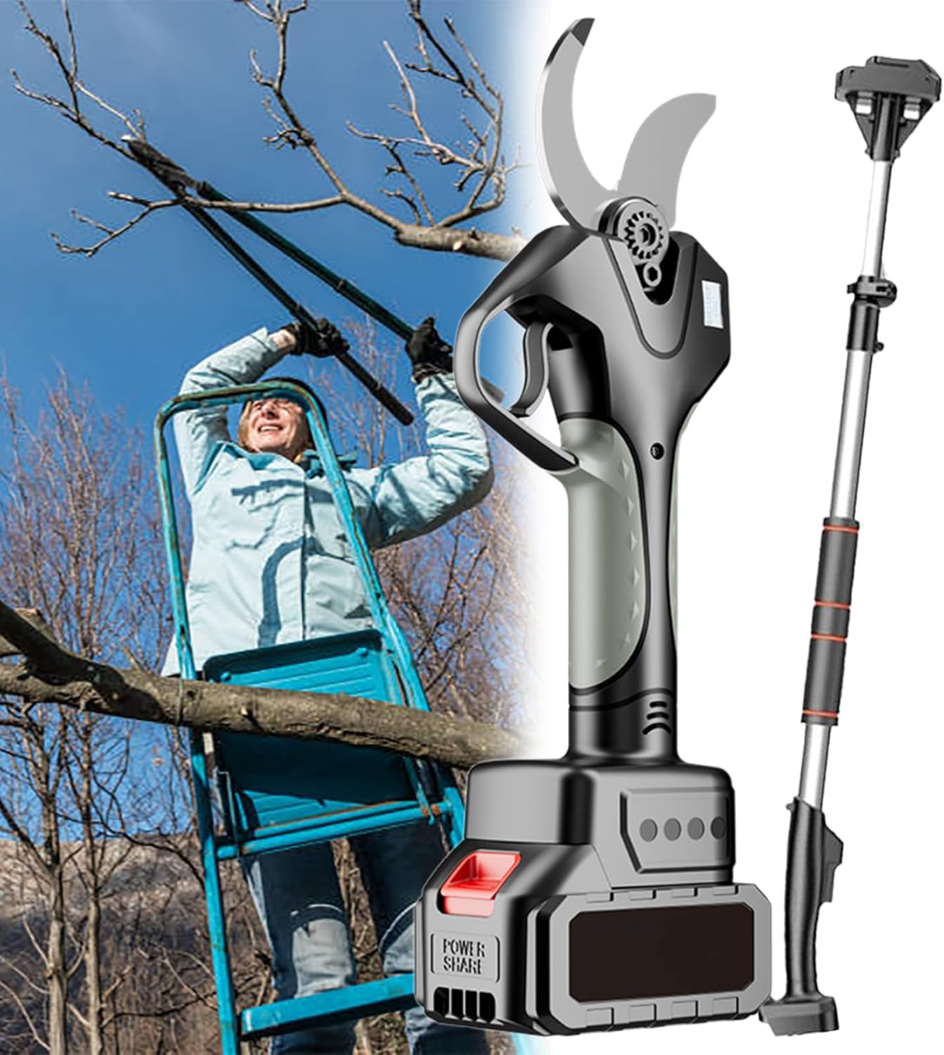 Electric Pruning Shears with 6.5FT Pole, Max Cutting Diameter 1.1inch (28mm) with 2×2Ah, 500W Cordless Pruner Shears Brushless Motor, Working time 4-6H for Orchards, Farms (One part)