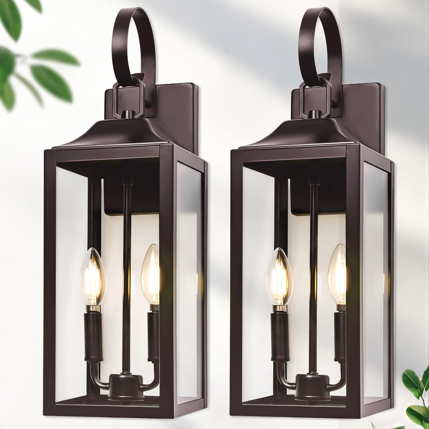 19" Oil Rubbed Bronze Outdoor Wall Lantern 2-Light, Large Outside Modern Sconce Light Fixture, Brown Porch Light Wall Mount with Glass, Waterproof Farmhouse Exterior Lamp Lighting, 2 Pack