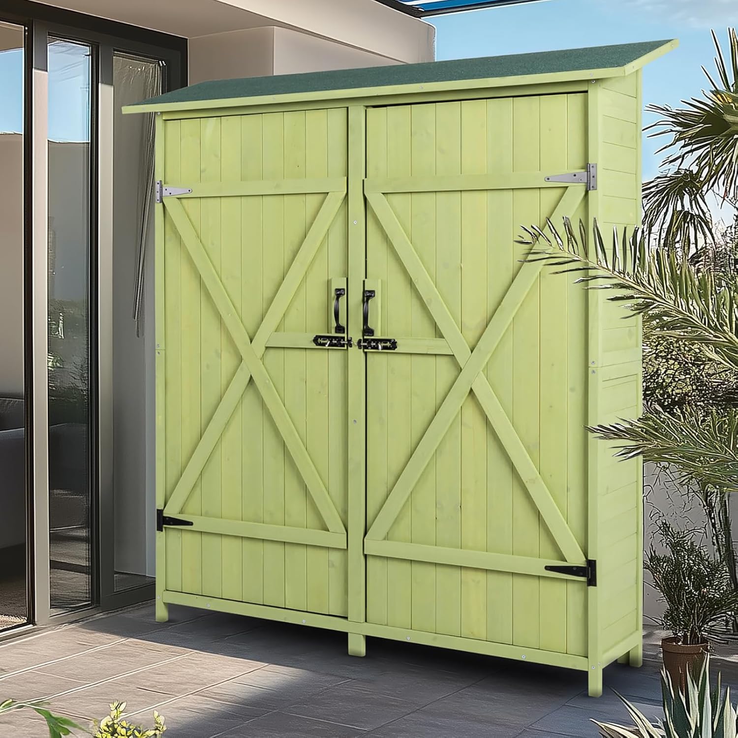 64" Tall Wooden Outdoor Storage Shed Vertical Garden Tool Storage Cabinet House with Floor & Double Doors,Bike Lawnmower Garbage Can Shed Organizer for Backyard Outside Patio Lawn Deck,Green