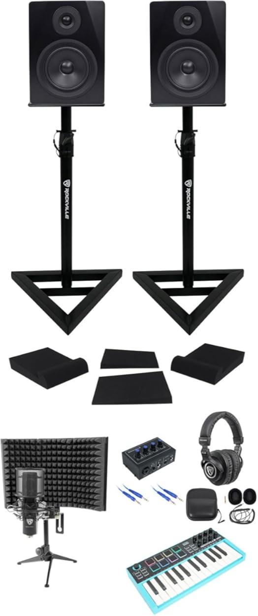 Rockville Bundle: Rockville ROCK-U MINI Computer Recording Interface Bundle with MIDI Keyboard Controller, Studio Mic, Headphones, (2) Speakers, (2) Stands, Mic Shield, (2) Isolation Pads (13 items)