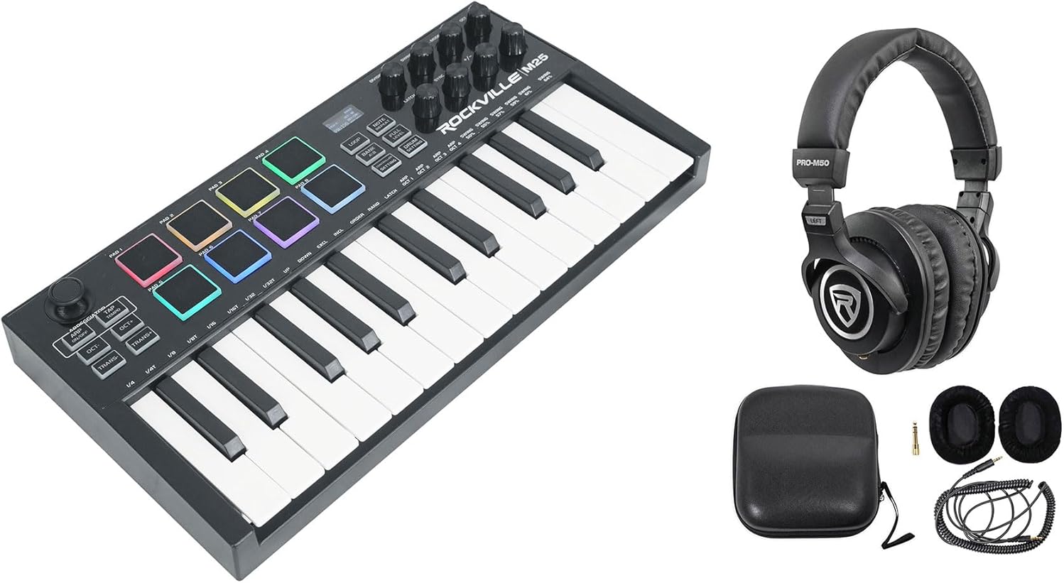 Rockville M25 Black 25 Key USB Wireless Bluetooth Keyboard Controller+Headphones