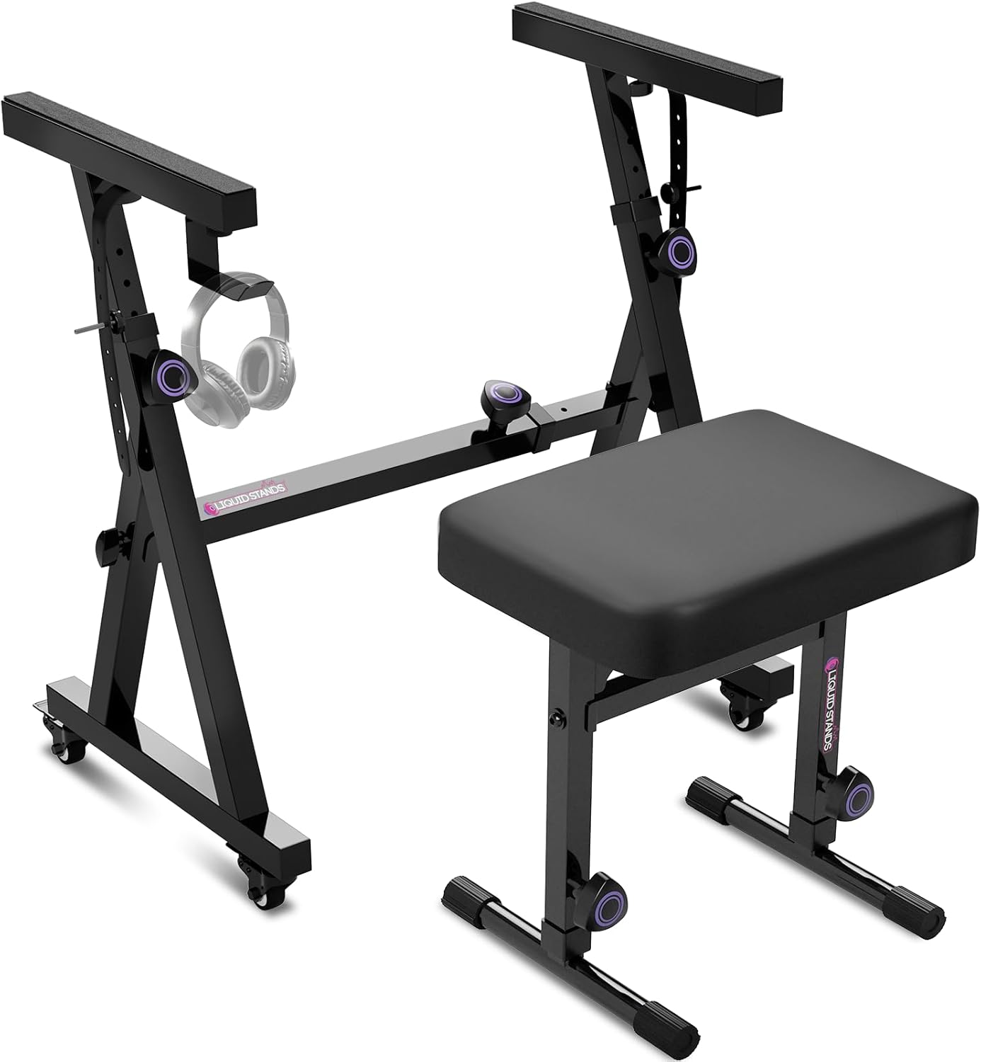 Liquid Stands Piano Keyboard Stand and Bench Set - Portable Heavy Duty Music Stand for 54-88 Key Electric Pianos & Adjustable Piano Bench, Stool - Sturdy Keyboard Music Accessories w/ Wheels and Seat